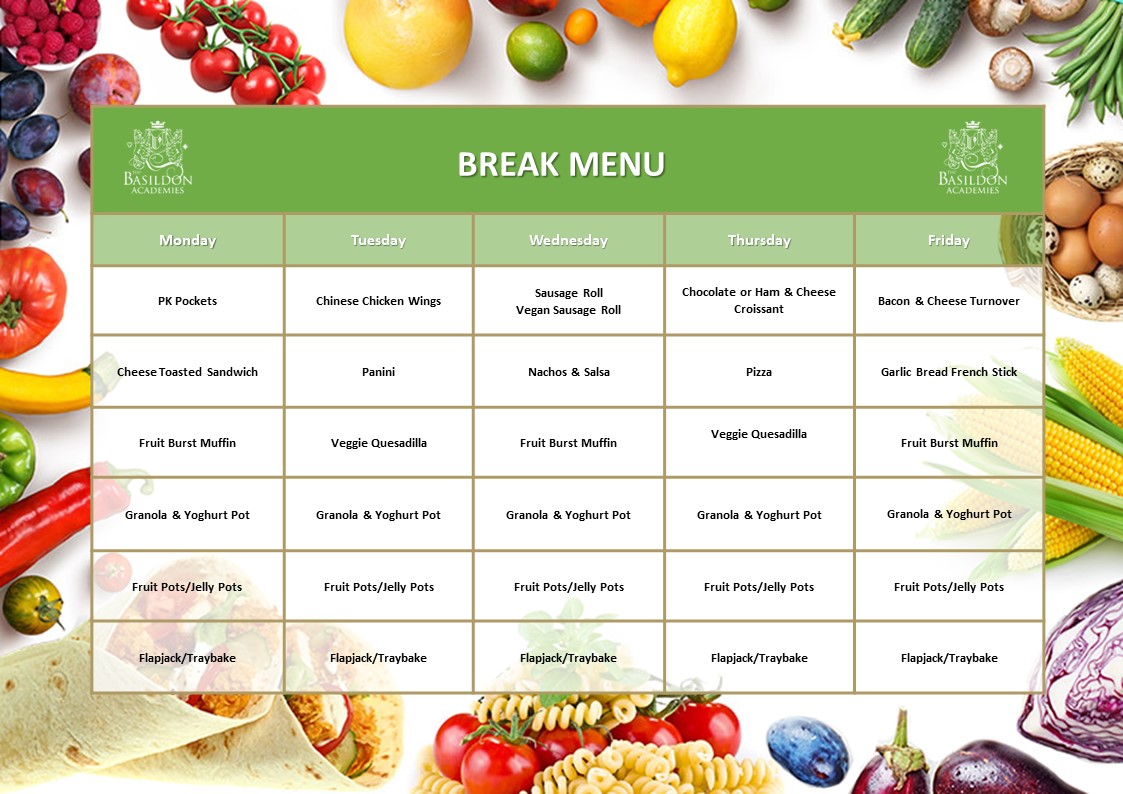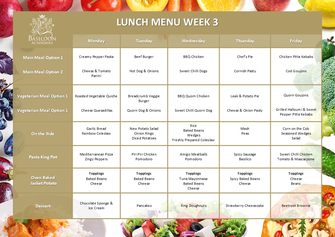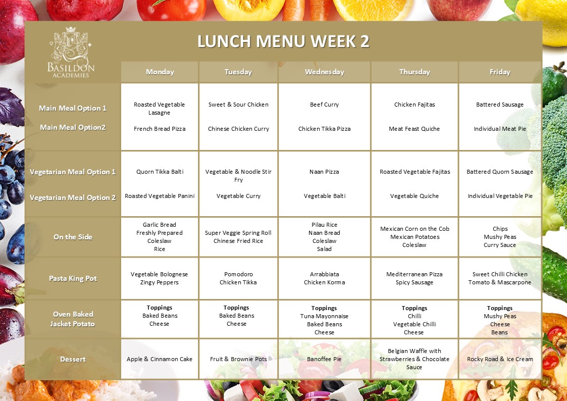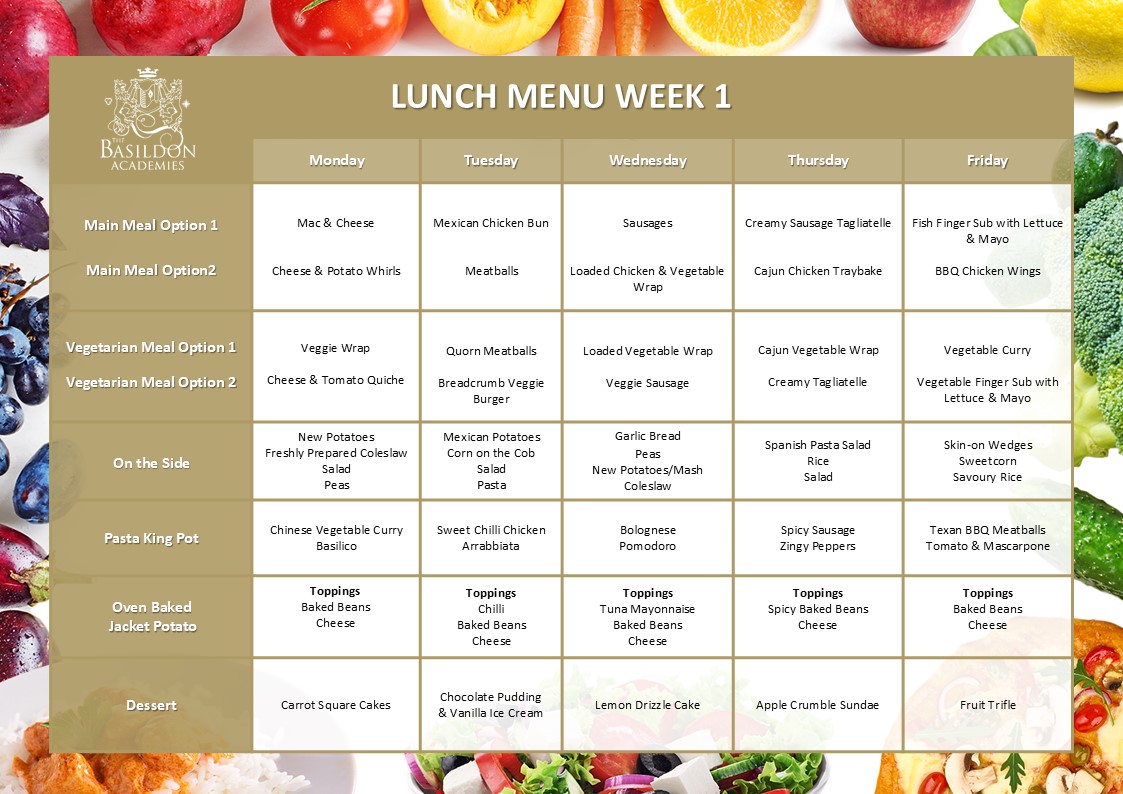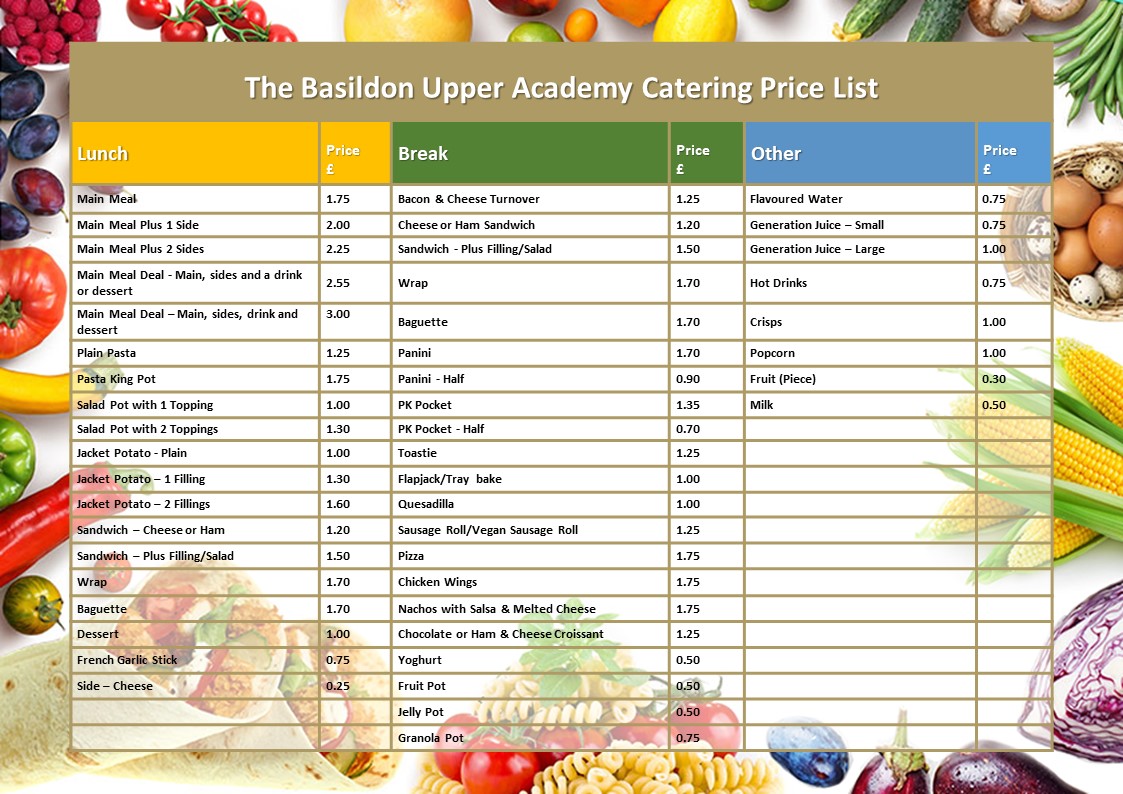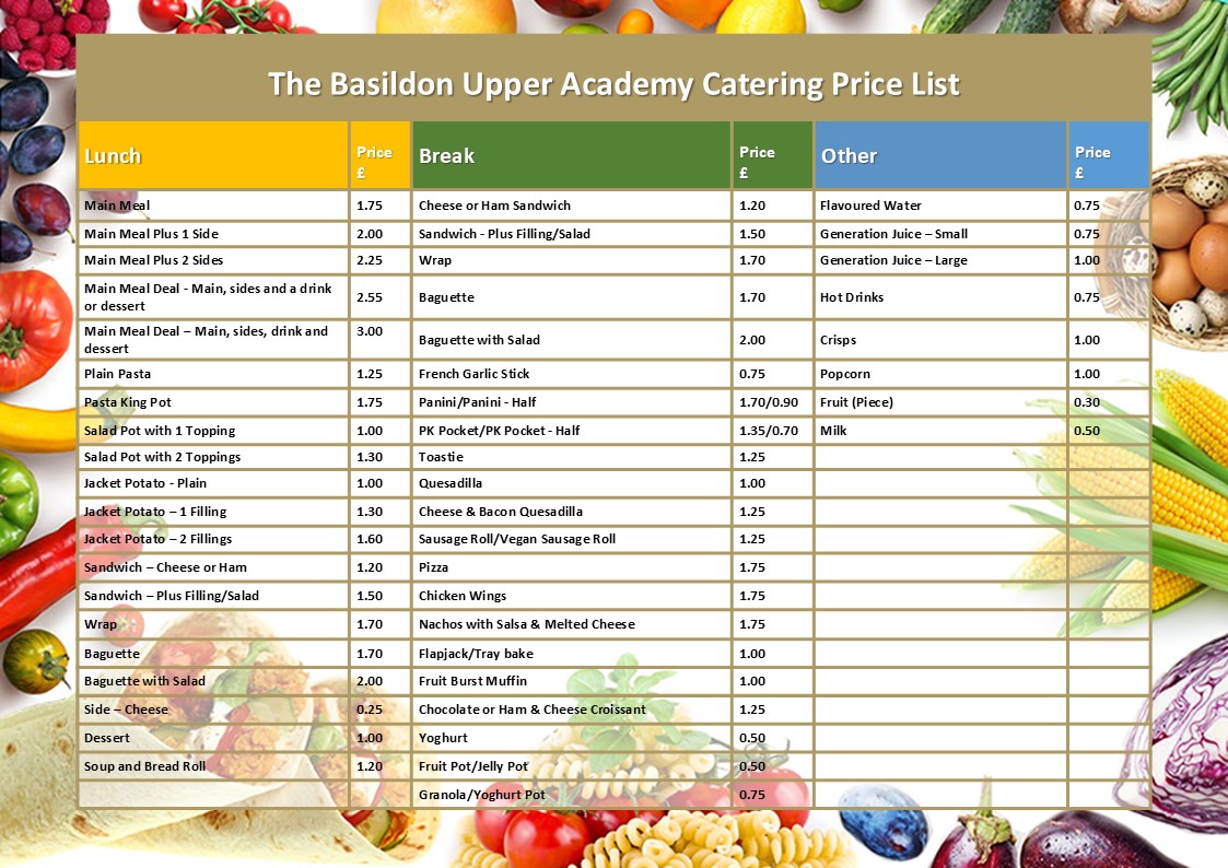 The Basildon Academies offer a range of healthy balanced meals, freshly prepared and cooked daily by a team of caring catering staff. Our produce is locally sourced with a local farm supplying our greengrocery; a family run butcher providing our meat and our groceries are from just over the border in Suffolk.