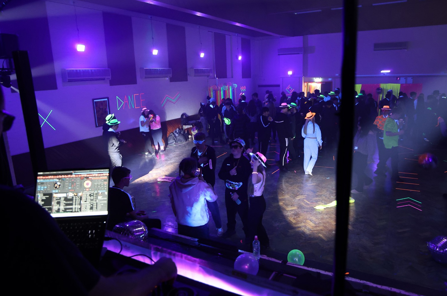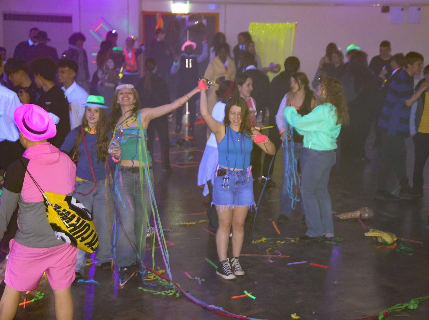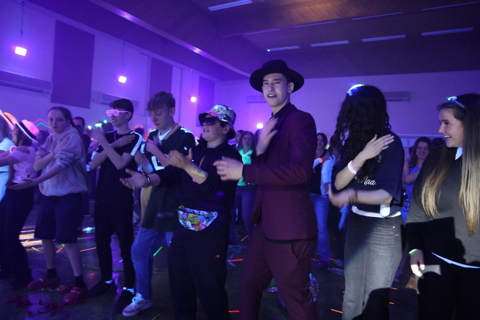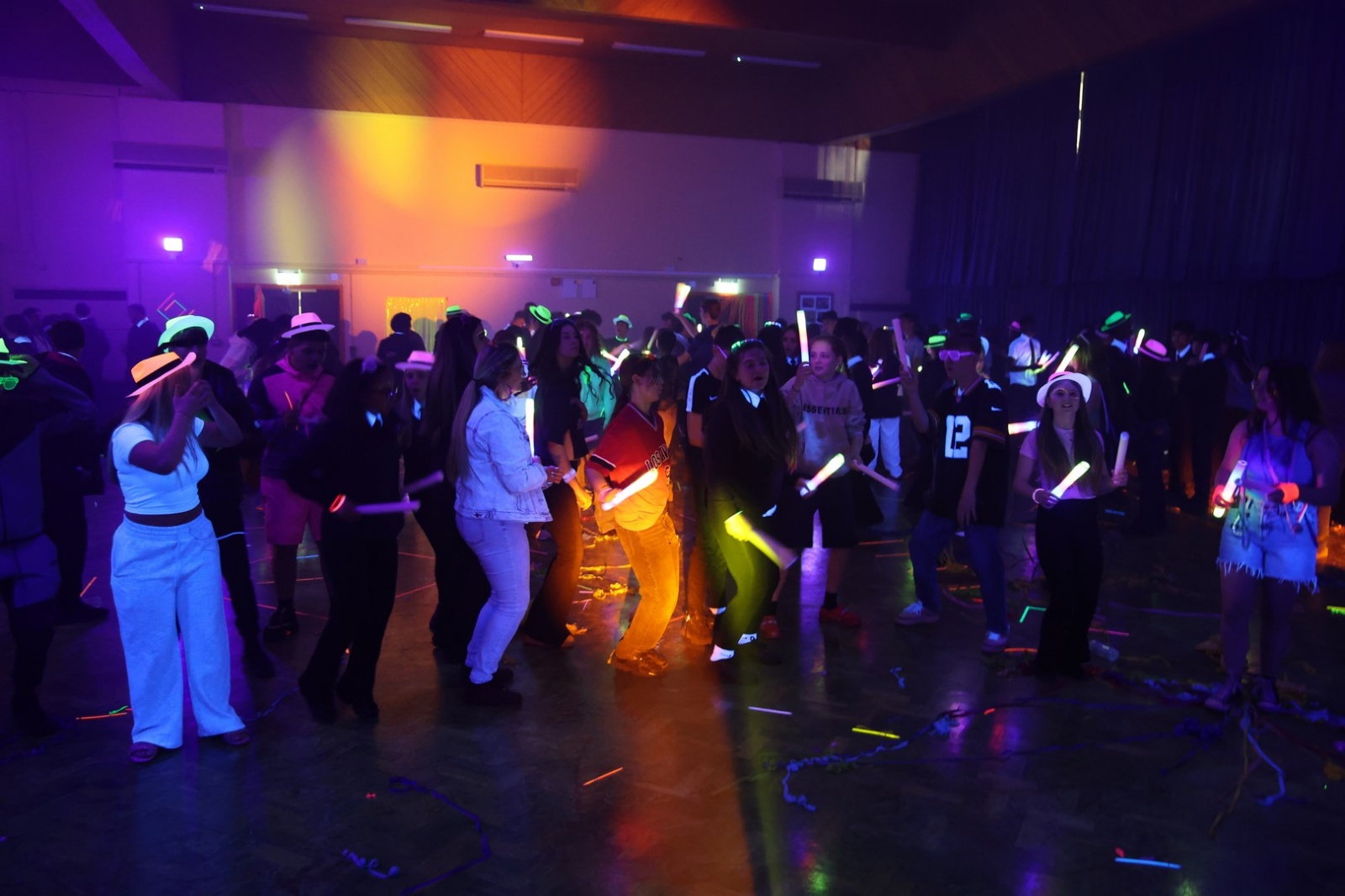 Stepping back in time, the school hall was transformed for a 90s-themed party, complete with disco vibes, UV lighting, and plenty of neon accessories. Students enjoyed light-up glasses, glow sticks, and inflatable props in a dedicated photo area, creating a fun and vibrant atmosphere throughout the afternoon.