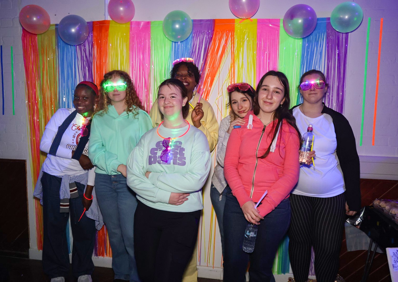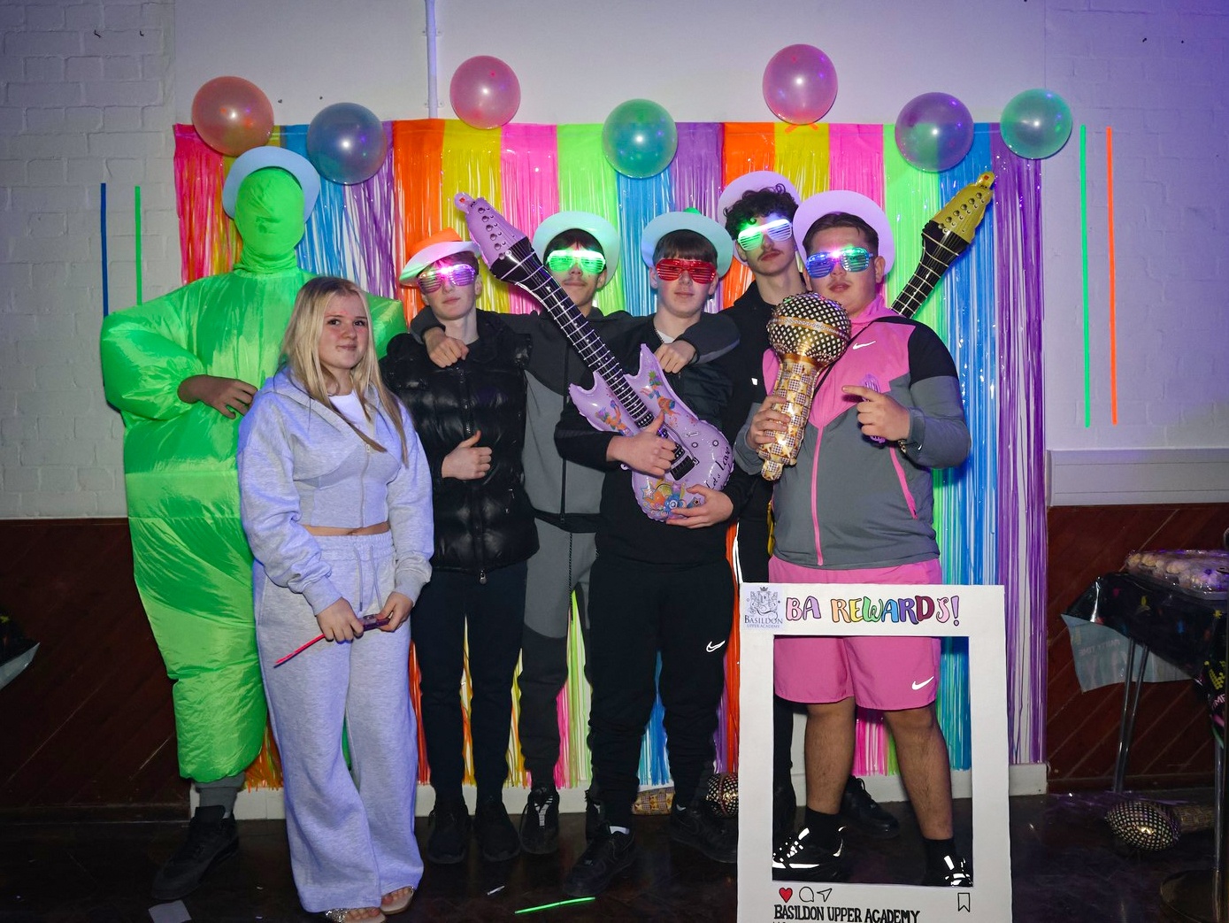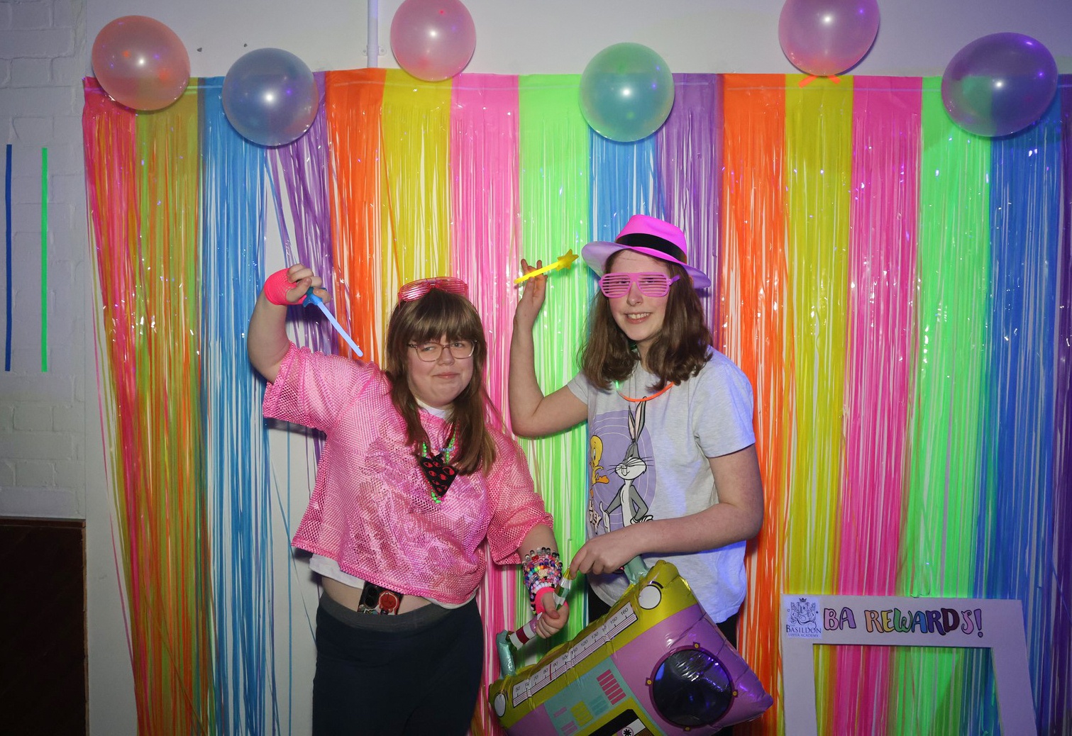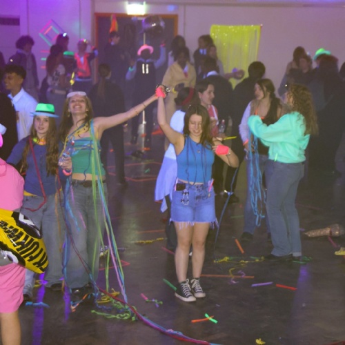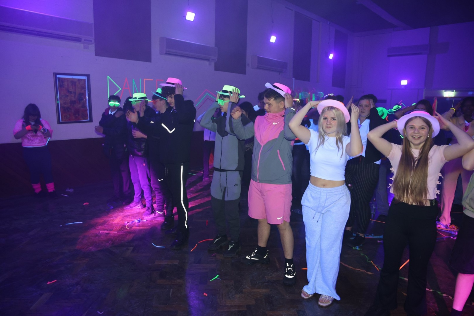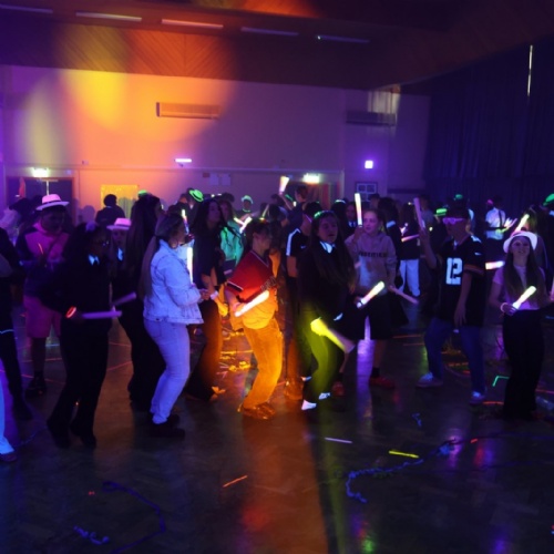 Stepping back in time, the school hall was transformed for a 90s-themed party, complete with disco vibes, UV lighting, and plenty of neon accessories. Students enjoyed light-up glasses, glow sticks, and inflatable props in a dedicated photo area, creating a fun and vibrant atmosphere throughout the afternoon.